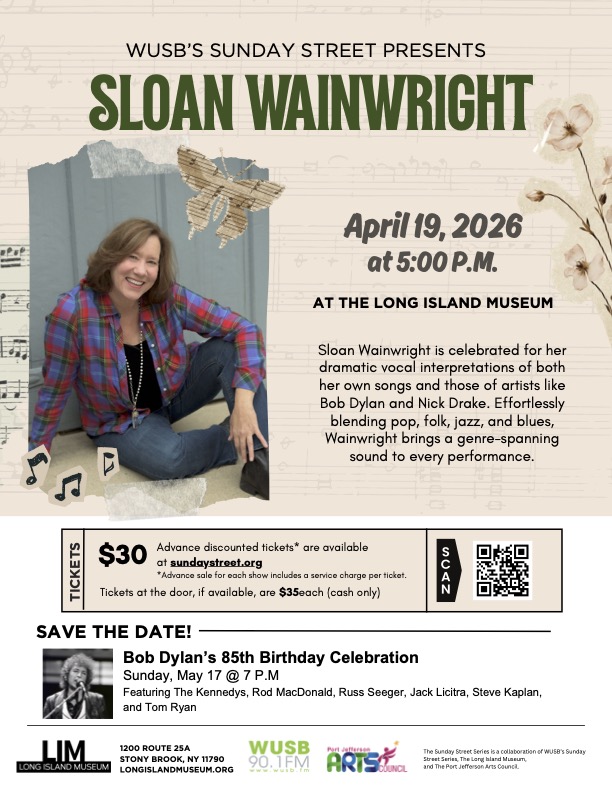 WUSB’s Sunday Street series welcomes Sloan Wainwright, known for her powerful vocal interpretations and genre-spanning style that blends pop, folk, jazz, and blues. Her performances feature both original songs and interpretations of artists such as Bob Dylan and Nick Drake. April 19, 2026 • 5:00 PM Tickets $30 advance tickets at sundaystreet.org (service charge applies) $35 at the door if available (cash only)